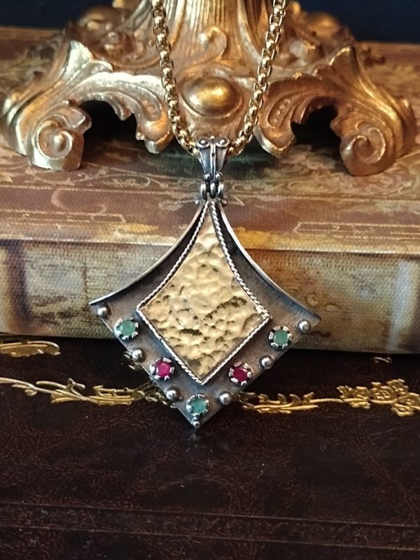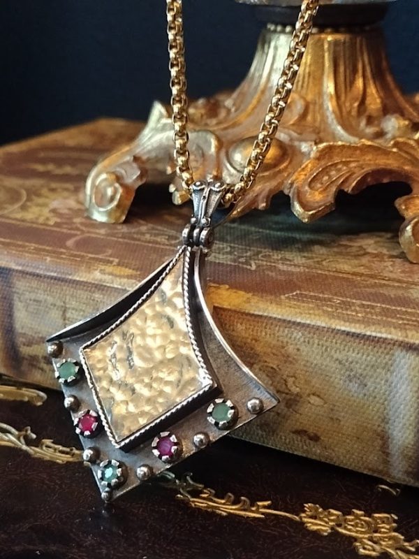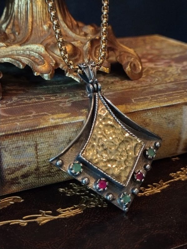 Secret chiefs psychic sight portal rare ensorcelled magickal pendant vessel. This uniquely designed Talisman is truly extraordinary. Handcrafted Oxidized Sterling Silver and 24K GOLD set with genuine Emerald and Ruby stones.  Unusual detail on the bail.