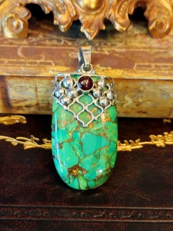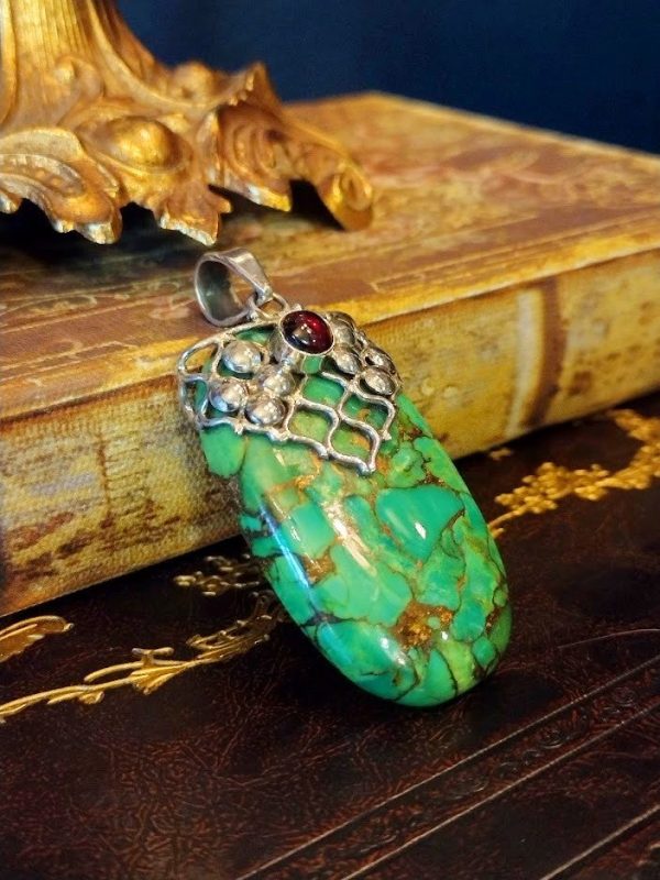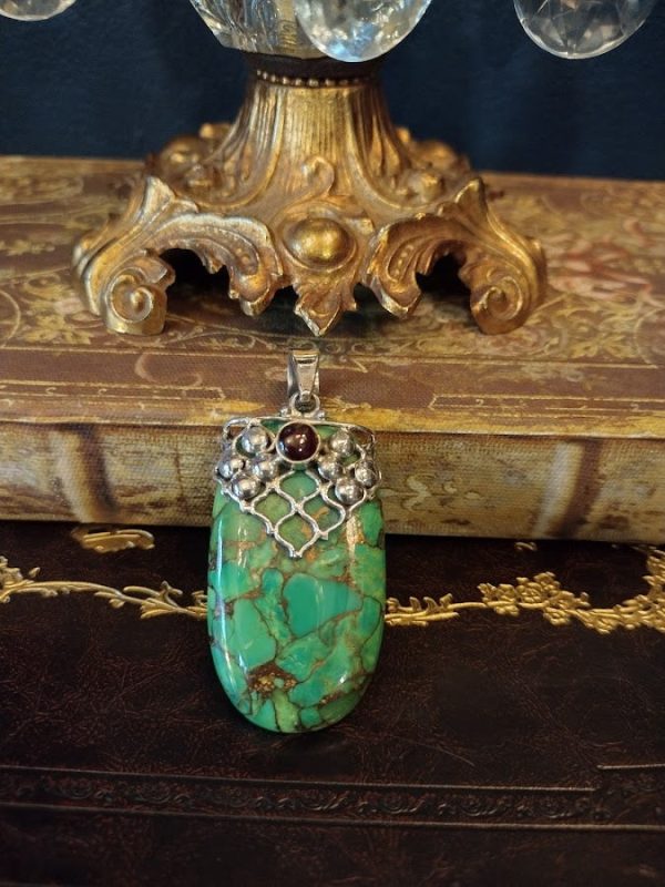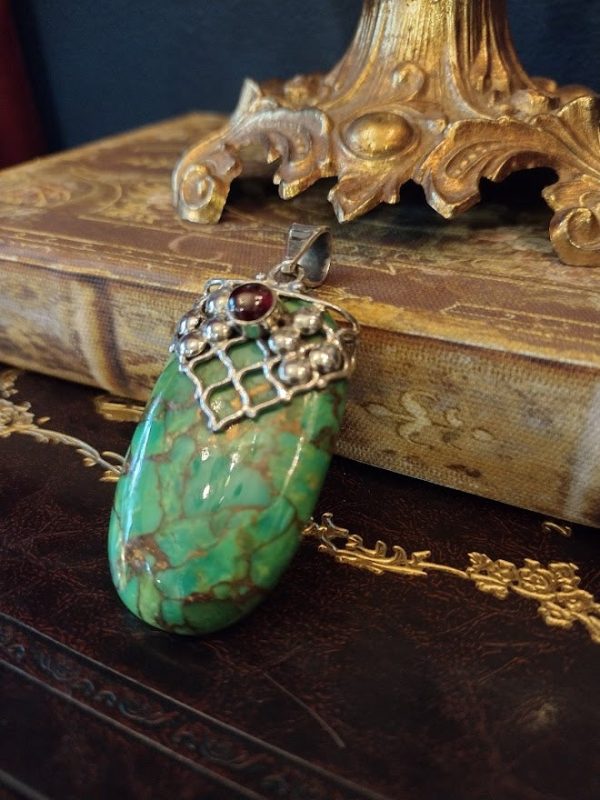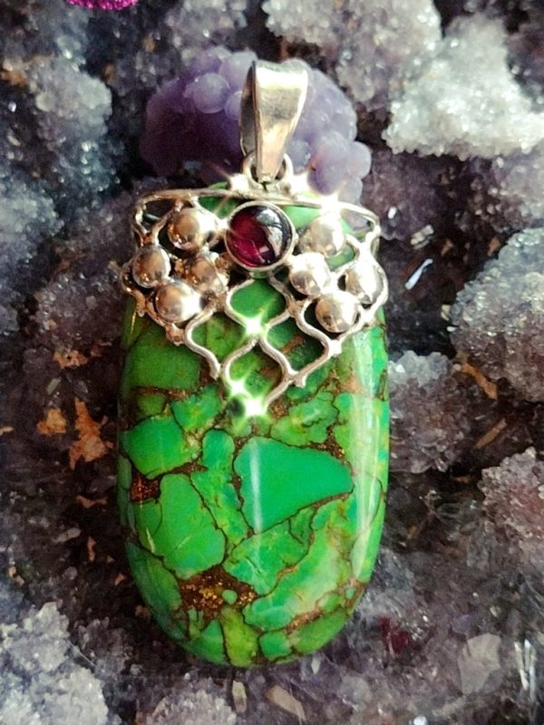 This Divine Talisman is truly extraordinary. Fully handcrafted~Astoundingly Beautiful Green Copper Turquoise wrapped in uniquely designed Solid Sterling Silver. Features an Amethyst Crystal in the center. Super rare and unique.